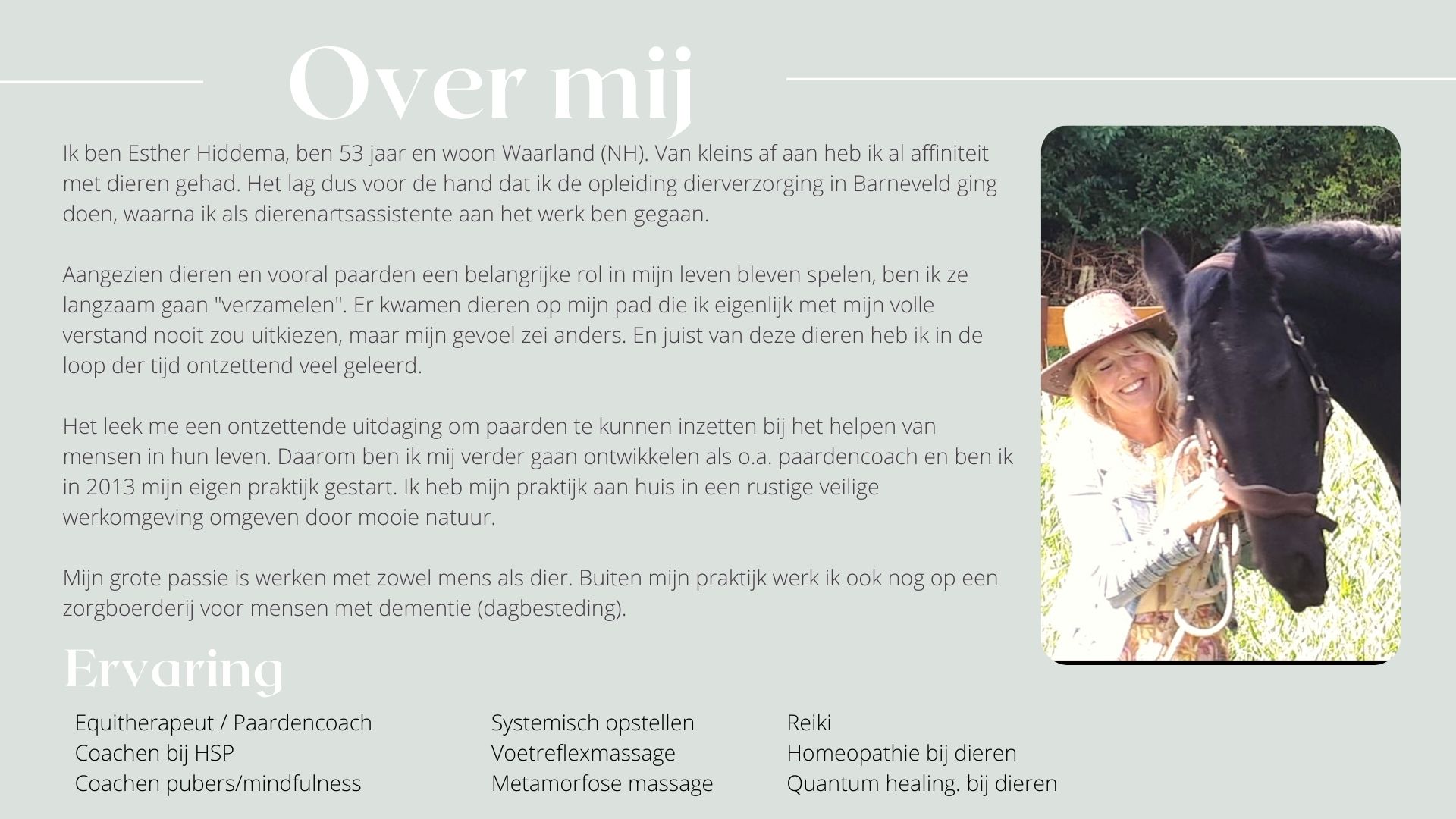 Ik bied zorg aan iedereen die dit nodig heeft, meestal met behulp van paarden, maar ook zonder of een combi hiervan is mogelijk.